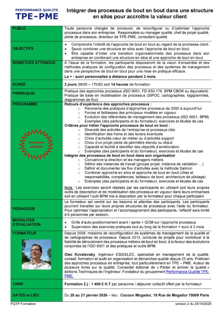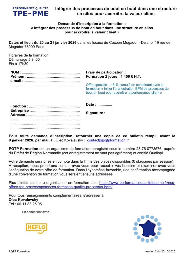 Nous avons le plaisir de présenter notre prochaine formation, les 20 et 21 janvier 2026, portant sur l’intégration de processus de bout en bout dans les entreprises dotées de structures majoritairement hiérarchiques et en silos (ci-joint fiche de présentation et de demande d’inscription) : Intégrer des processus de bout en bout dans une structure en silos